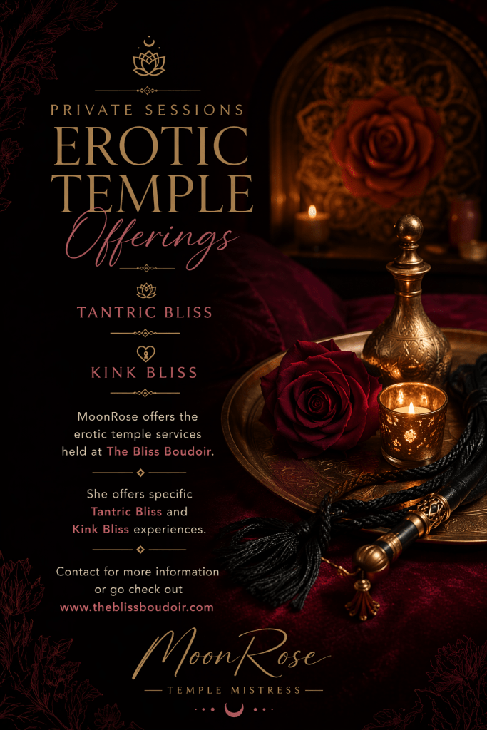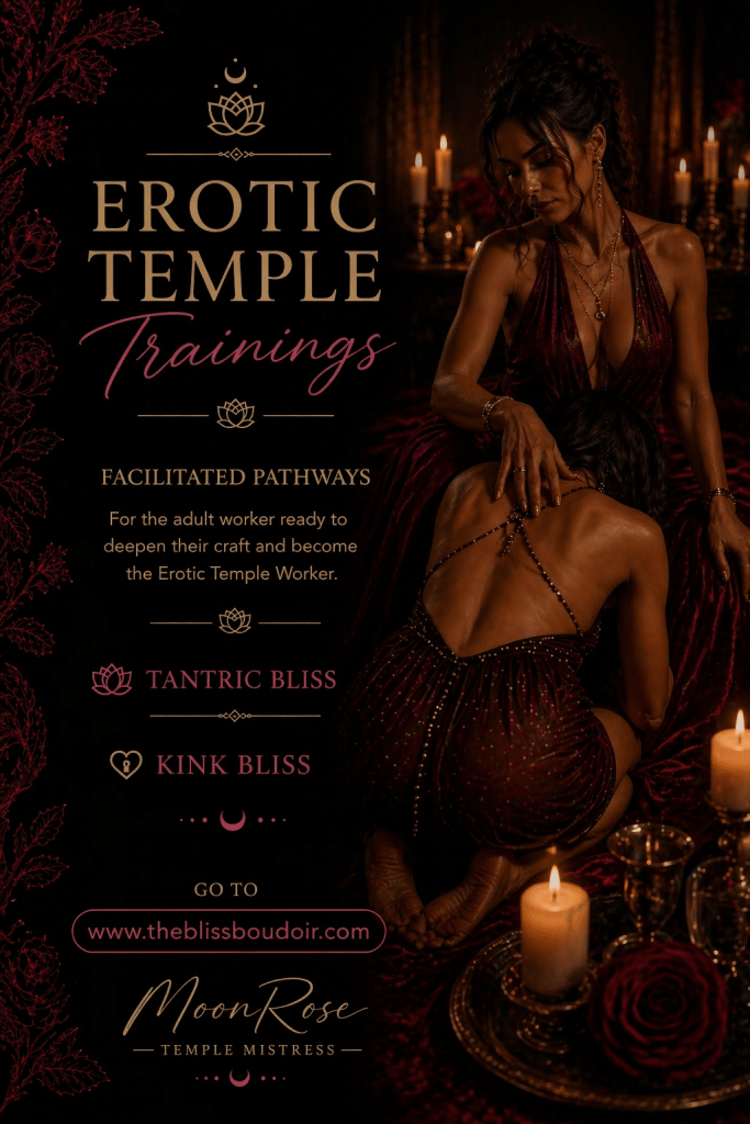 Check out The Bliss Boudoir – Erotic Temple Sessions and Trainings available by MoonRose Magick. These experiences are more experiential rather than educational as you are taken into the realms of Sacred Sexuality. This is a permission for pleasure and desire to be explored to expand your mind, body and sensual soul into full body bliss.
